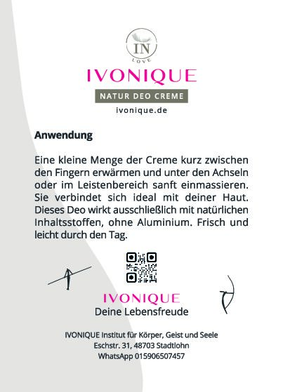 Meine liebe Kundin Iwona hat diese Deocreme aus ihrem Leben heraus entwickelt. Mit echter Hingabe und langer Erfahrung. Als erfahrene Kosmetikerin weiß sie genau, worauf es ankommt. In ihrem wunderbaren „Institut für Körper, Geist und Seele“ begleitet sie jeden Tag Menschen dabei, ihre ganzheitliche Balance zu finden und die Wichtigkeit der Selbstfürsorge in die Welt zu tragen. Von Massagen, über Gesichtsbehandlungen bis hin zu Yoga-Kursen, darf sich hier jeder in einer warmen Atmosphäre verwöhnen lassen.